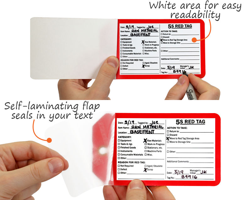• • 5S Red Tags are available in multiple sizes from jumbo 3.25” x 7” that are easier to write on and read, to standard 3.375” x 5.875”.