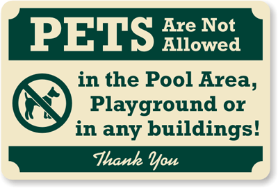 Keep pets away from pool areas and playgrounds. A sign is a great, continuous enforcement tool.