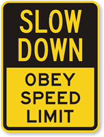 Save lives fast! Slow Down signs prevent accidents daily. Choose from a huge selection to put near a construction site, school, blind corner, hill, etc. Quickly grab attention with a Slow sign.