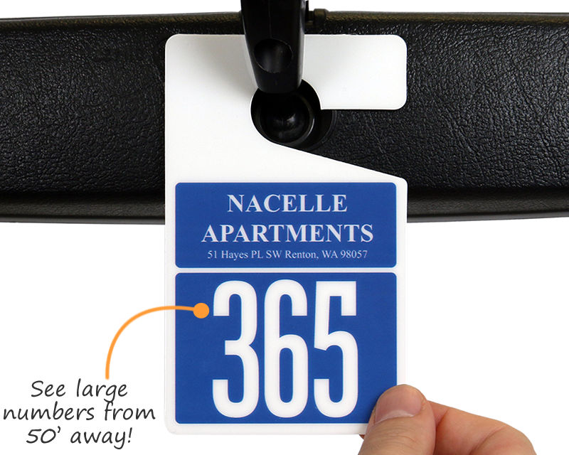 We offer Apartment Parking Permit Hang Tags in a variety of sizes to match different requirements. Measuring 3”x2.75”, our mini tags go right behind the mirror and do not block the driver’s view. These tags are available in both ready-to-ship and custom designs. We also offer horizontal Parking Permit Hang Tags for apartments, which measure 4.75”x2”. Horizontal permits convey all essential information in a suitable size yet do not pose any risk for the person behind the wheel.
