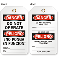 A bilingual lockout tag displays safety warnings in two languages, such as English and Spanish, to ensure a wider range of employees understands the message.