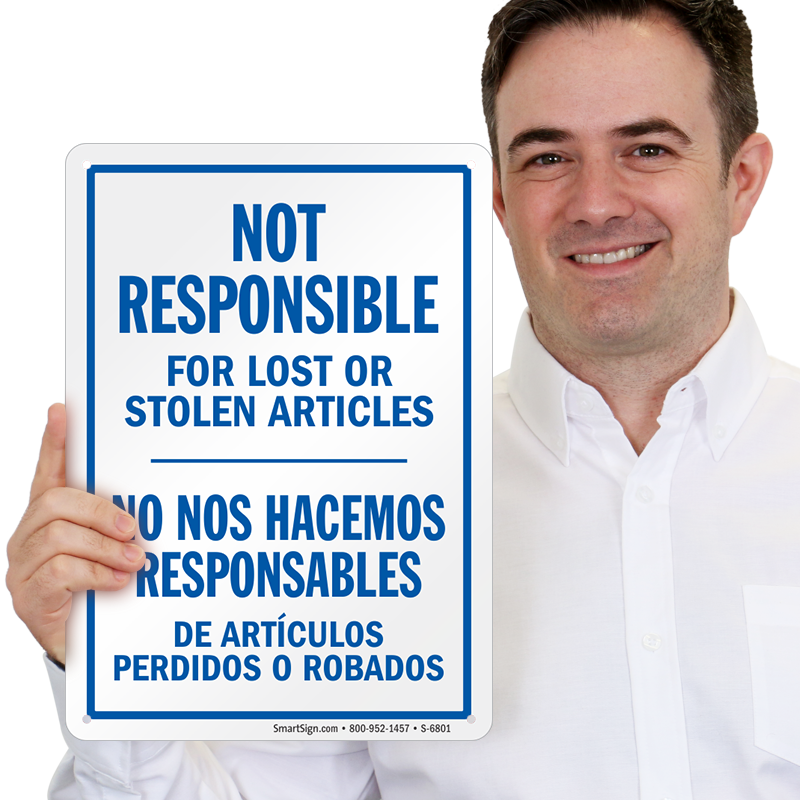 Bilingual Company Not Responsible Sign: Not Responsible For Lost Or Stolen Articles / No Nos Hacemos Responsables (English/Spanish) S-6801 Learn More...