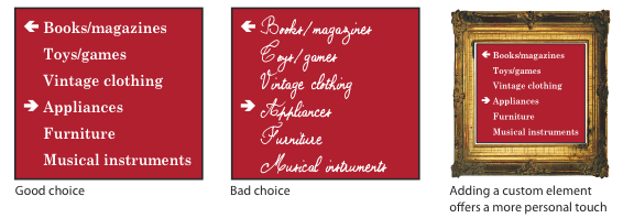 When in doubt it’s probably best to err on the side of caution in this regard and stick with something familiar and readable so that your messages are easily viewed. Retail environments are especially tricky because so many things are vying for the customer’s attention; the wide variety of colorful products, the packaging, point of sales displays, etc. can cause your signage to disappear into the fray. The example below shows three signs with the same content but different typestyles. Rather than relying on a typographic style to give your business a personal touch, keep the sign content traditional and, if desired, get more creative with the sign panel treatment.
