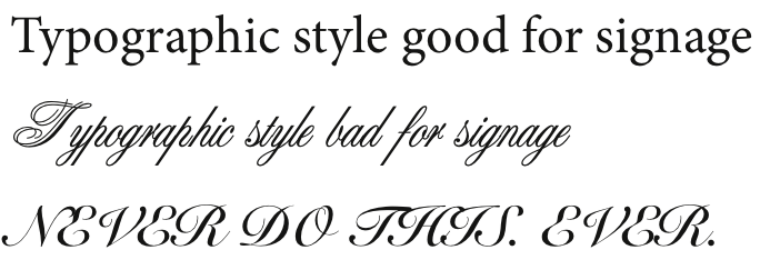 Some typestyles are more obvious than others but there are a couple of basic guidelines that make for better choices for your signage: