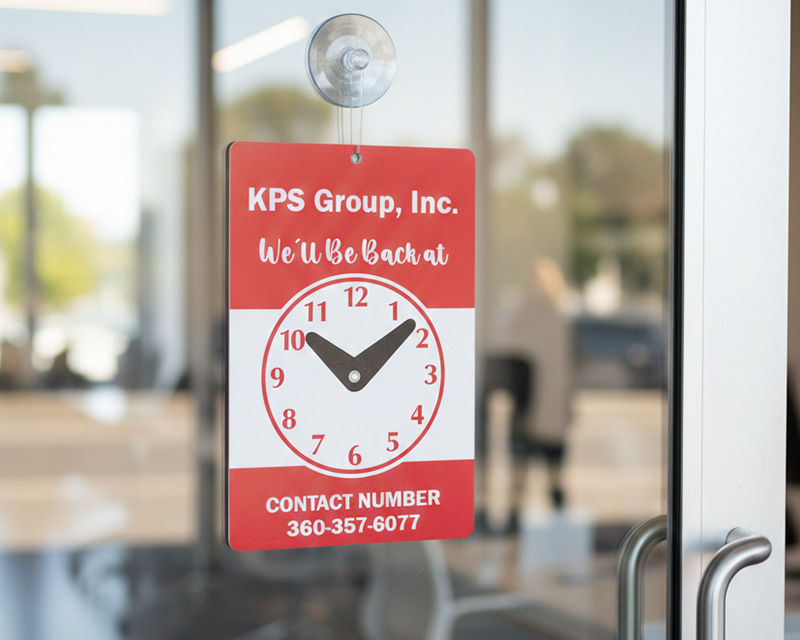 Adjustable clock signs feature moveable hands or sliding markers that indicate opening/closing times or return times, with some including separate weekday/weekend displays or multiple clock faces for complex schedules. Check out our be back clock signs video for an example.