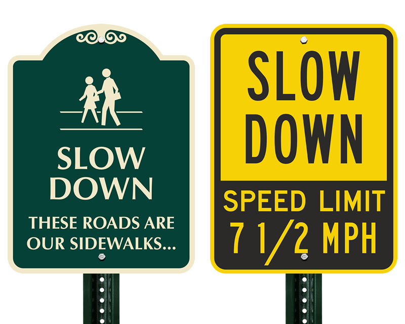 They should be posted in advance of areas where pedestrians, animals, or hidden exits are located to prompt drivers to brake before they reach the hazard. Just like diamond road signs, placement is key, the sign must be visible early enough to allow for a safe reduction in speed.
