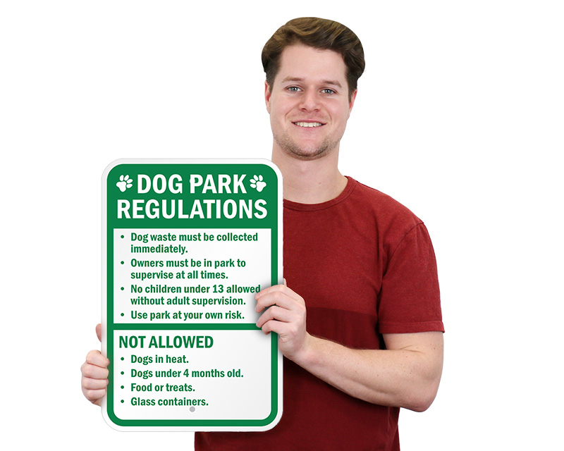 We recommend using large, highly visible signs, such as 18" x 24" Dog Park Signs, placed at eye level near the entrance gate to ensure all users see the full list of regulations before entering the off-leash area.