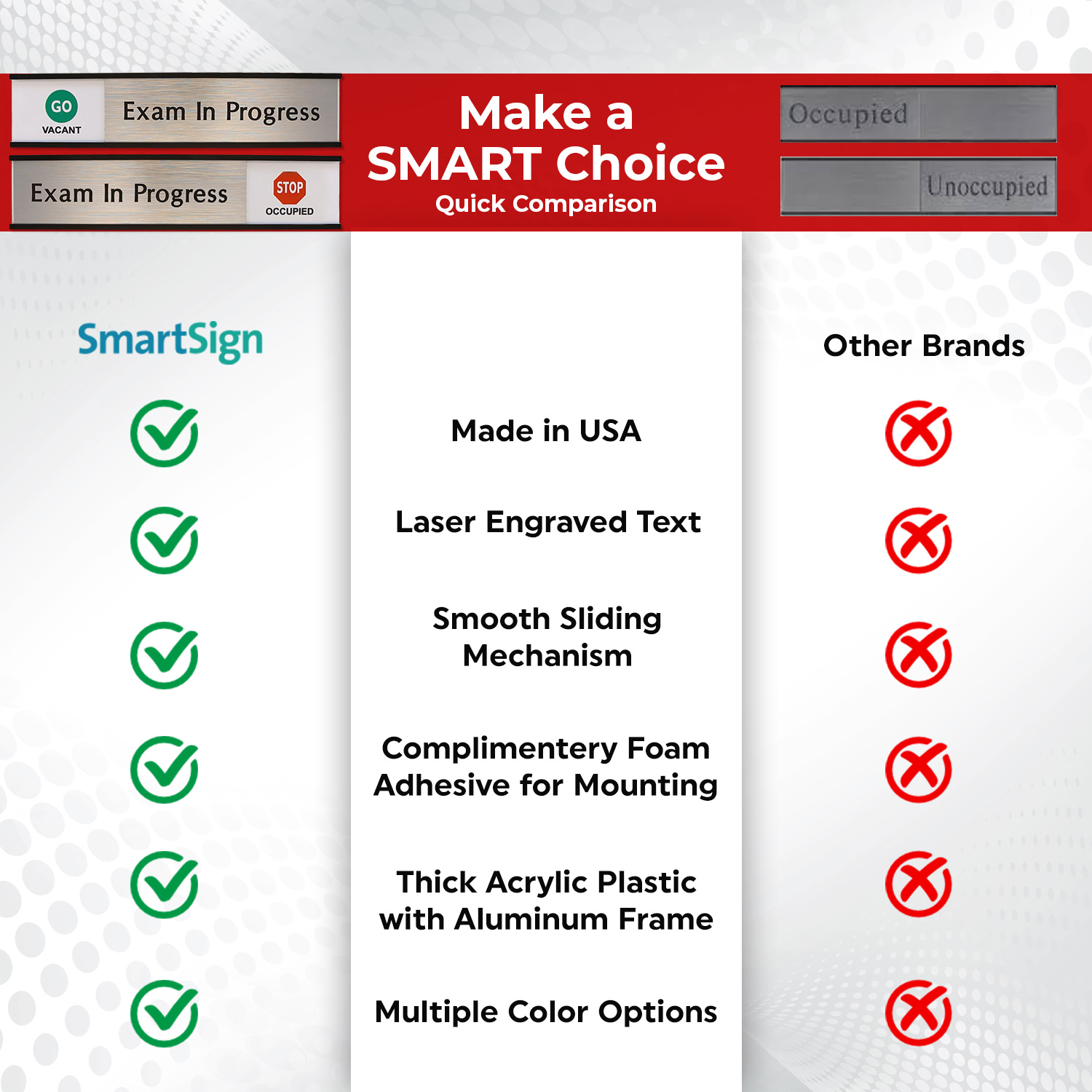 Easy slider signs show if the exam room is free or occupied. Avoid embarrassment! High bond adhesive backing is included with your order.