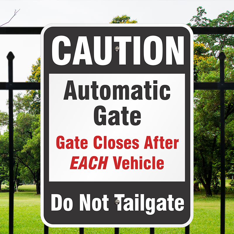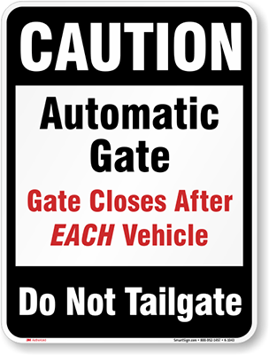 Gate Warning Sign: Caution Automatic Gate Closes After Each Vehicle Do Not Tailgate K-1043 Learn More...