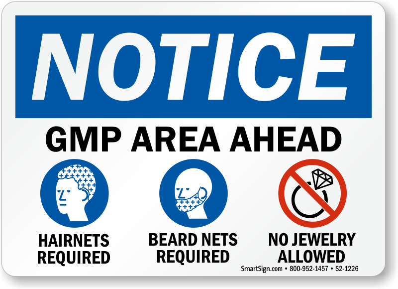Ensure product quality based on good manufacturing practices. Use this GMP Area Ahead Sign to notify employees to remove their jewelry, wear hairnets and beard nets before entering.