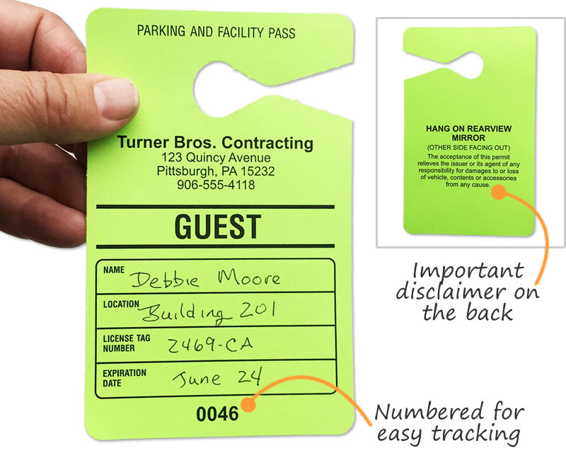 • • Order mini behind-the-mirror tags, jumbo permits, or cardstock fluorescent tags imprinted with your name. Fluorescent tags are ideal for short term or daily use. Plastic passes are durable enough for re-use by other guests and last for years. Oversized plastic guest passes are easy to hang, yet hard to lose!