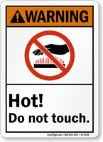 Our hot surface do not touch ANSI caution sign is appropriate for surfaces that may cause minor burns, our hot surface do not touch ANSI warning sign suits serious burn risks, and our hot danger sign is reserved for surfaces that could cause severe or fatal burns on contact.