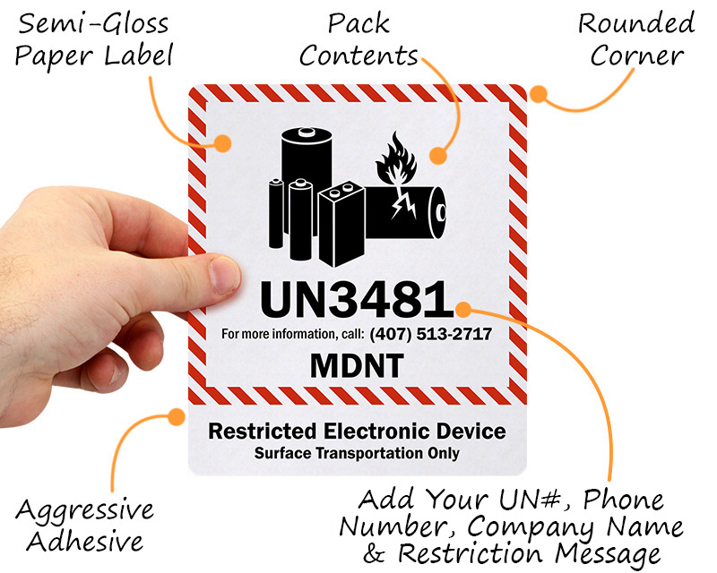 • • Comply with USPS Publication 52 regulation using our custom label with additional info tab. USPS now forbids used, damaged or defective devices with lithium batteries to be mailed by air. Labels must be marked with Restricted Electronic Device and Surface Transportation Only messages.