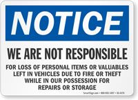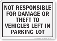 Better safe than sorry. Not Responsible for Theft, Lock Your Car Signs remind drivers to lock their cars and keep valuables out of sight. Protect yourself from liability for lost, stolen or damaged items by posting necessary warnings.