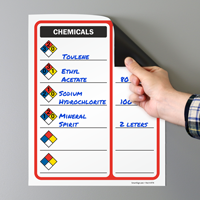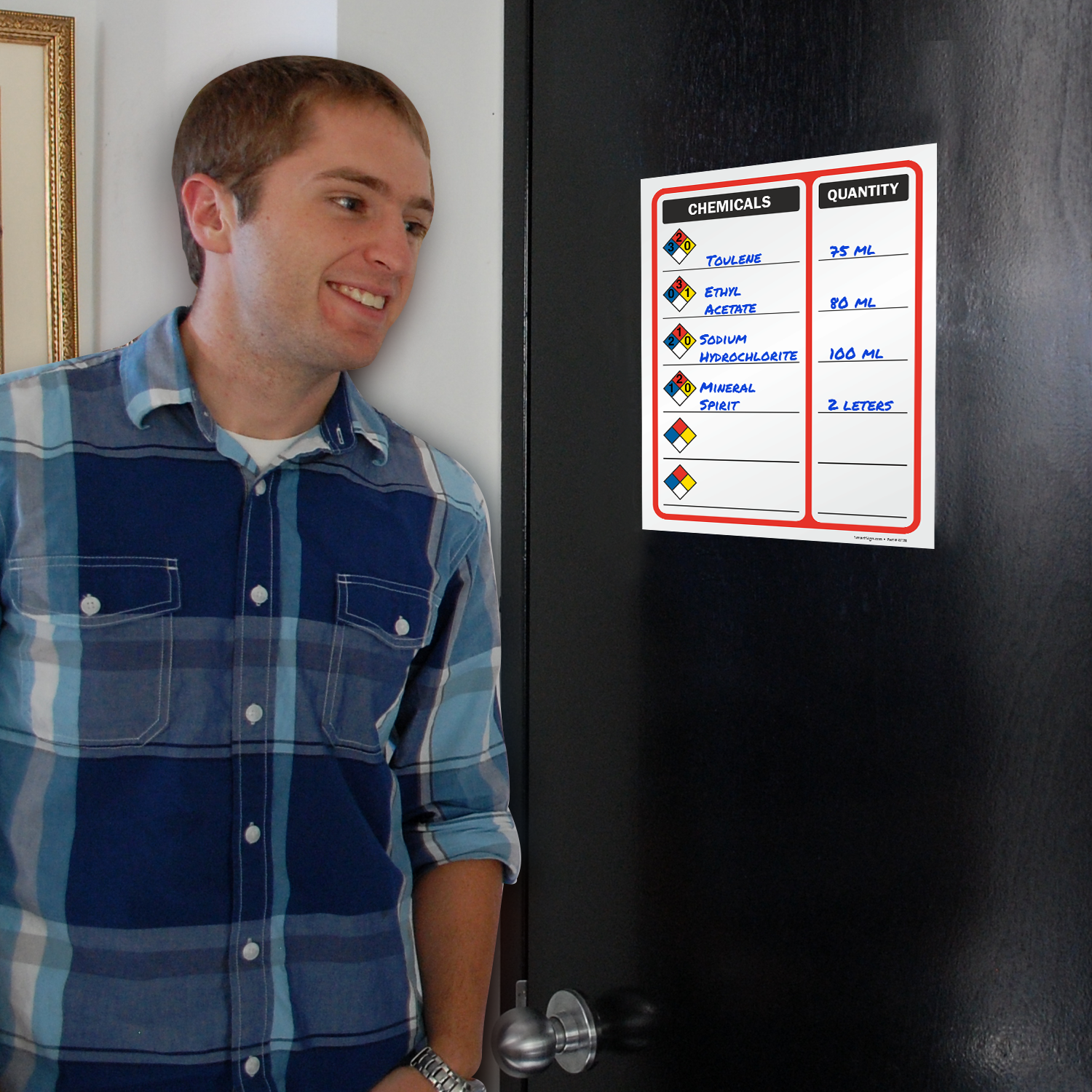 - Adheres to any steel cabinet and can be removed without any difficulty - no more sticky adhesive residue. Includes space for identifying up to six chemicals along with their quantities.