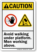 A caution: men working or falling objectssign is used to warn people on the ground level that work is being performed overhead. This alerts them to the risk of being struck by falling tools or materials. This is a core part of construction job safety.