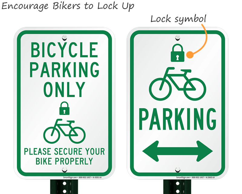 Key signs include "Bicycle Parking Only" signs (like this bicycle parking sign with lock symbol) to clearly designate storage areas. Regulatory signs such as "No Parking Bike Lane" help keep designated routes clear. For safety in pedestrian zones or shared paths, customizable "Walk Your Bike" signs or stencils are crucial for improving safety by encouraging cyclists to dismount. Choosing the right combination ensures clear communication and safe management of bicycle traffic. Official guidance on bicycle signage can be found in the MUTCD Part 9B regarding Signs for Bicycle Facilities.