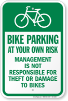 We provide signs that clearly state messages like "Bicycle Parking At Your Own Risk" or similar wording indicating that management is not responsible for theft or damage. Posting these signs, potentially alongside general security reminders like "help prevent theft signs", establishes clear expectations for cyclists and can help protect the property owner in the event of loss or damage. Note: While signs can help, consulting legal counsel regarding premises liability in your specific jurisdiction is always recommended for comprehensive risk management.
