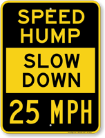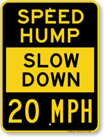 Our designer SignatureSigns communicate the speed bump/hump ahead warning in style. However, these are not official DOT MUTCD-compliant signs and are not meant for use on public roads. You may use these signs on a controlled private property only. They are ideal for large spaces of hotels, resorts, apartment complexes, offices, assisted living and even factories and schools.
