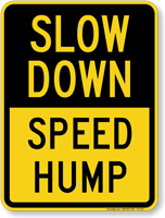 Our designer SignatureSigns communicate the speed bump/hump ahead warning in style. However, these are not official DOT MUTCD-compliant signs and are not meant for use on public roads. You may use these signs on a controlled private property only. They are ideal for large spaces of hotels, resorts, apartment complexes, offices, assisted living and even factories and schools.