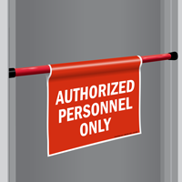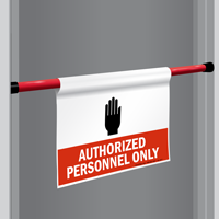 Our easy-to-install door barricade signs are perfect for this usage of limiting access to certain areas and/or rooms. The Door Boss Kit includes a 47” spring-loaded pole, compressed down to 27”, and a single-sided sign face measuring 11.25”x17.75”. The sign face is made using 10 oz heavy-duty vinyl and printed with UV-resistant inks.