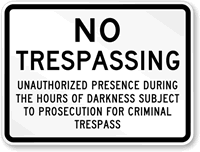 No Trespassing after Dark Signs are a first line of defense from burglars, vandals, and criminals illegally entering your property. Signs are bold and check any illegal activity on your property or offer warnings for trespassers.