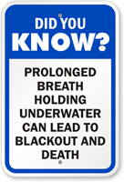 No Breath Holding Signs provide potentially life-saving warning that prolonged breath holding can be deadly. Make sure that teenagers, lifeguards, and everyone understands the drowning dangers.
