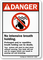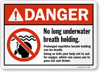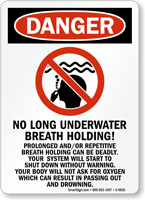 Extended breath holding can lead to "shallow water blackout," where a swimmer faints underwater due to lack of oxygen/co2 buildup and drowns silently. It is a leading cause of drowning for competent swimmers. This is why no breath holding signs are crucial.