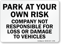 A simple sign can save you and your drivers many thousands of dollars. Alert drivers to parking risks in unsafe or unsecured areas. Use park at your own risk signs to prevent accidents, explain damages, and reduce your liability. Use for hotel, church or store parking lots. Protect against theft, careless drivers, snow… even foul balls.
