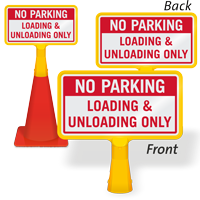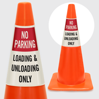 Our no parking loading zone ConeBoss signs are made of 3/16” thick plastic and laminated for superior durability. These injection molded cone signs lock on top of the most common traffic cones and are designed to not flop, wobble, or topple in the wind or by a brush of a hand.