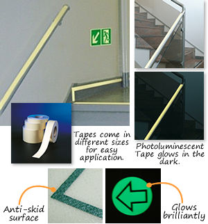 Photoluminescent Egress Tape is a revolutionary method of marking your egress path to safety. Use these markers, which require no electricity, to mark your stairwells and hallways with reliable glow-in-the-dark photoluminescence. These markers and arrows are a perfect solution for electricity-free egress paths that will glow, even in a blackout.