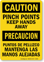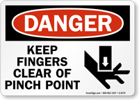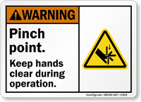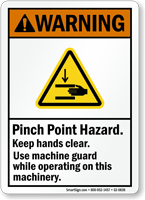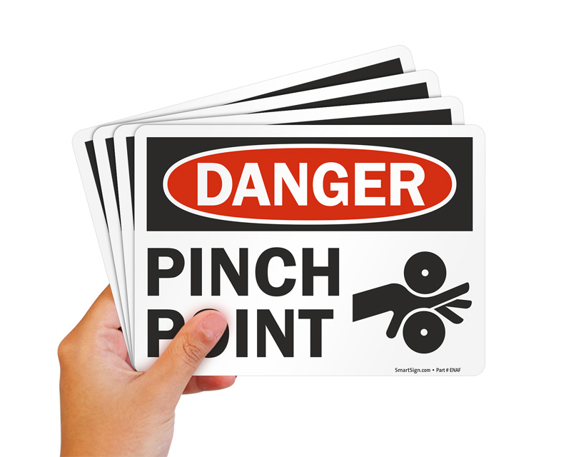 Yes, OSHA and ANSI Z535 require that machinery hazards including pinch and nip points be clearly marked with appropriate warning signs, and our pinch point signs are available in OSHA and ANSI-compliant Danger, Warning, and Caution headers with the correct color schemes and symbol pictographs to satisfy regulatory requirements at every piece of hazardous machinery.