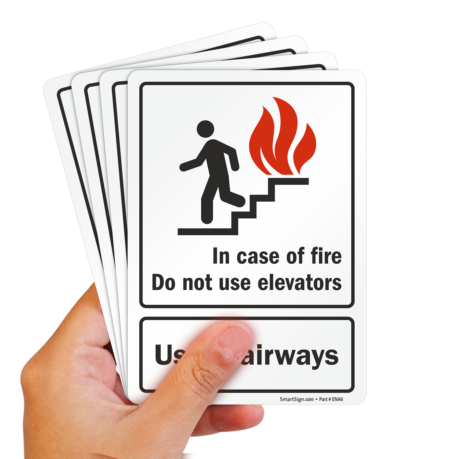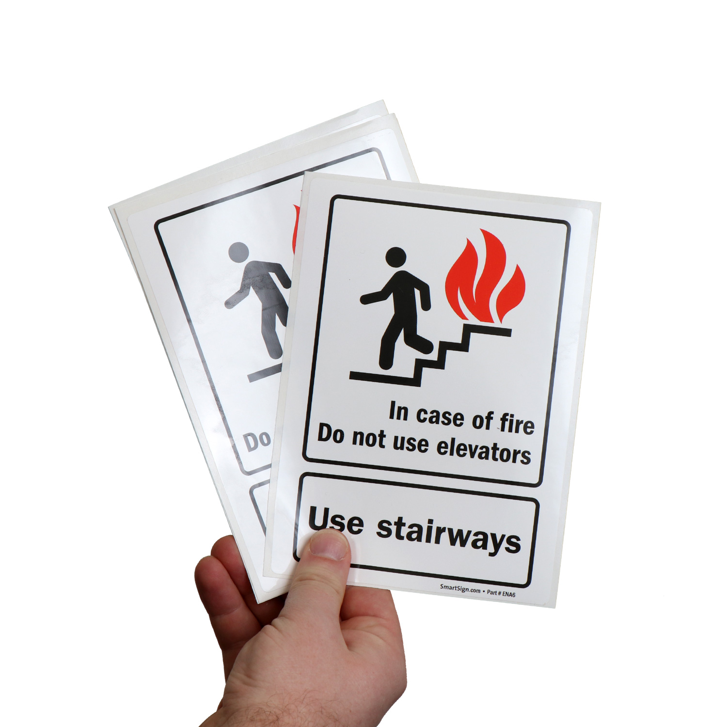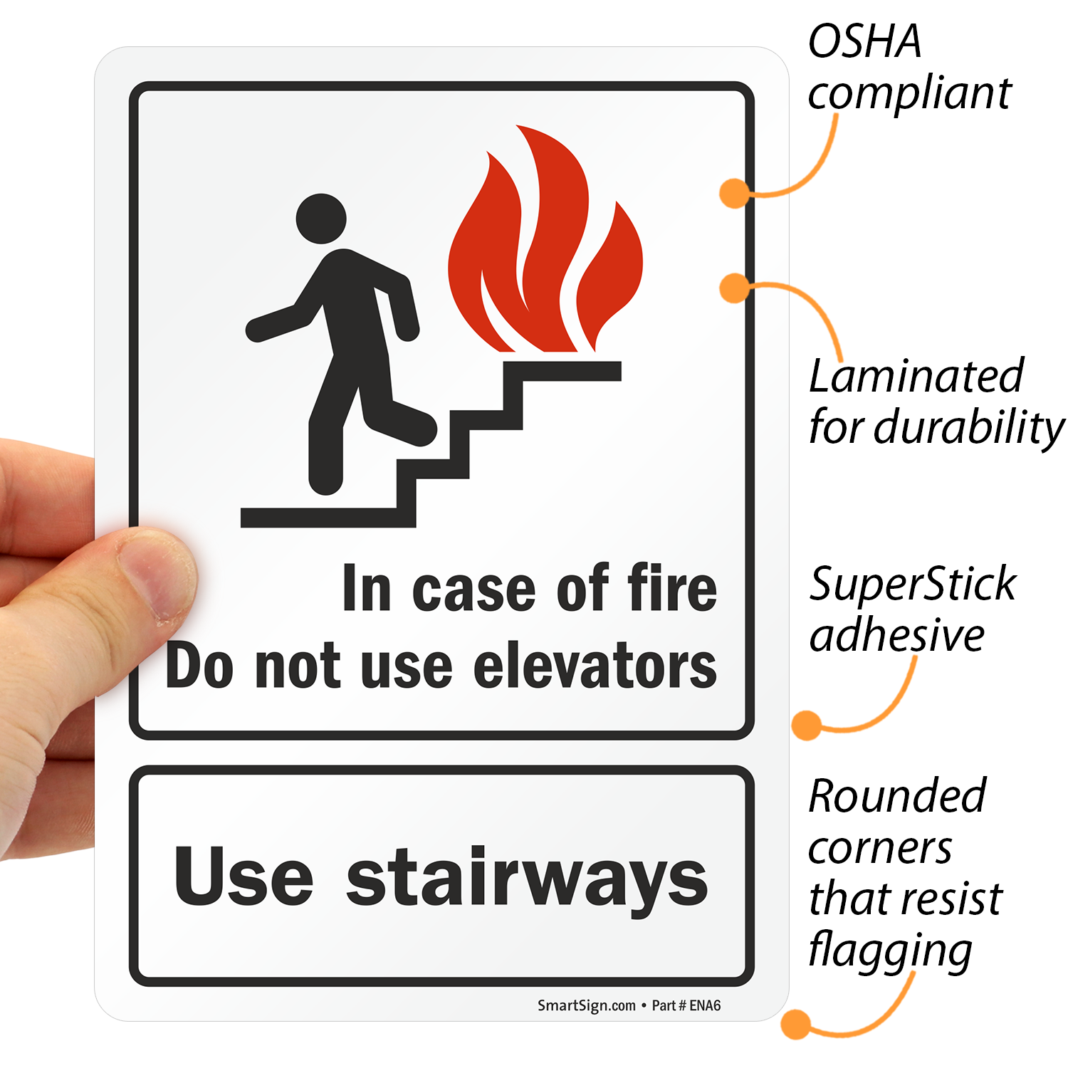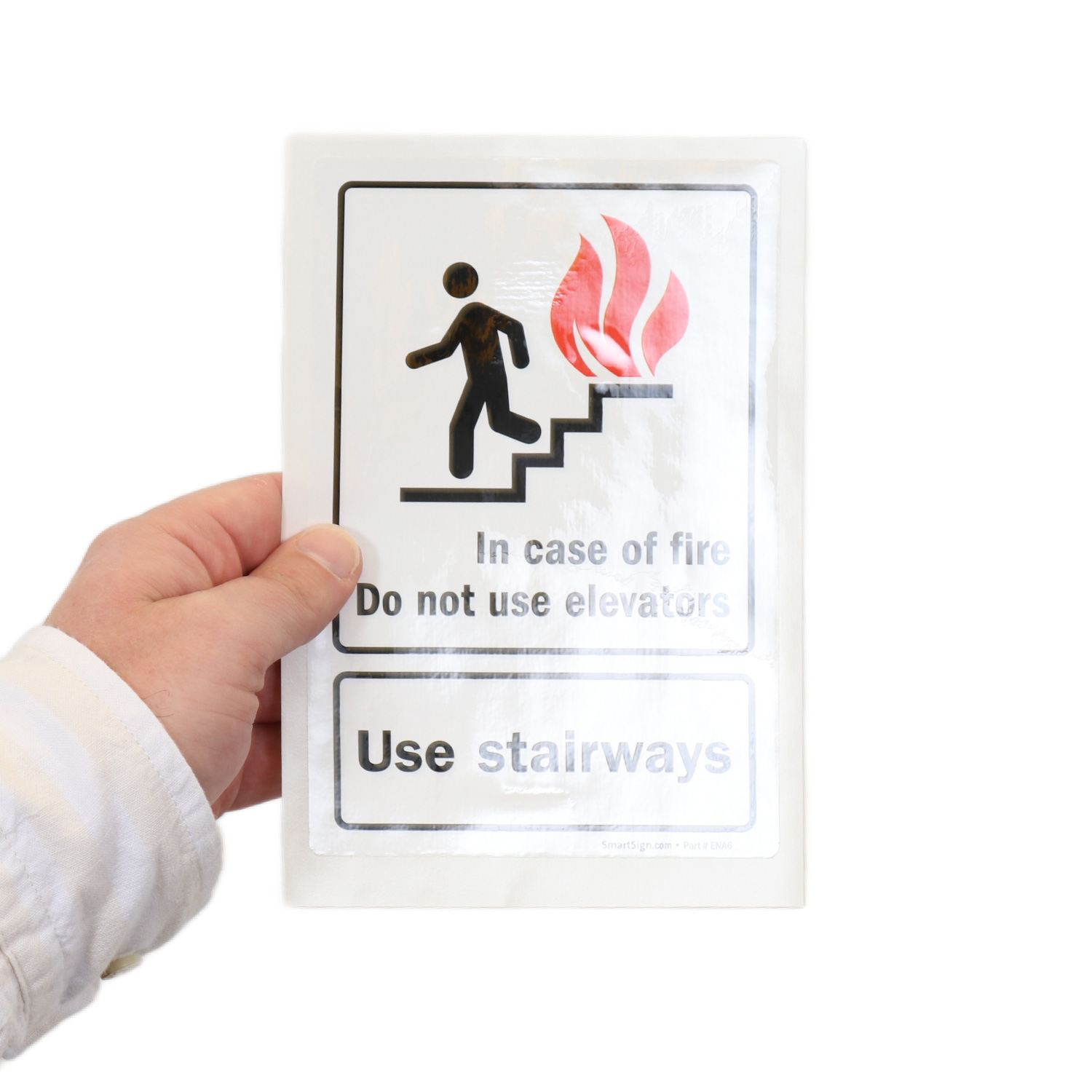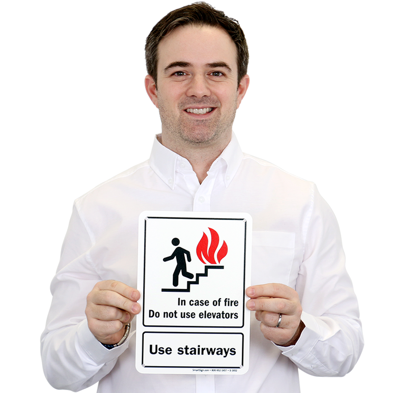 This fire and emergency sign is essential to keep occupants from using elevators when they may be risky. Graphic on the sign breaks language barrier and communicates your message to a wider audience.