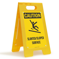 A folding A-frame like our caution wet floor sign is a portable, temporary warning deployed and removed quickly during mopping or spill cleanup, while a floor decal like our caution slippery when wet SlipSafe floor sign is a permanent adhesive sign applied to recurring hazard zones like ramp entrances or drainage areas.