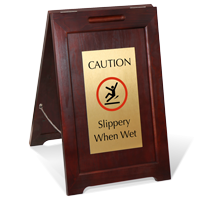 A folding A-frame like our caution wet floor sign is a portable, temporary warning deployed and removed quickly during mopping or spill cleanup, while a floor decal like our caution slippery when wet SlipSafe floor sign is a permanent adhesive sign applied to recurring hazard zones like ramp entrances or drainage areas.