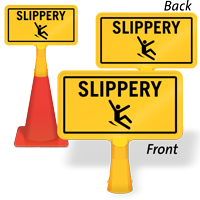 Our caution floor slippery when wet cone collar slides directly onto any standard safety cone for instant highly visible warnings, and our bilingual 4-sided safety cone sign offers maximum 360-degree visibility in open areas like lobbies, hallways, or large retail spaces.