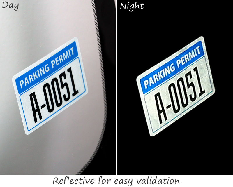 Reflective parking permit decals take vehicle and parking lot safety a step further. These are easily visible when the lighting is inadequate and shine brightly even with little light from headlights, flashlights, street lights, etc. Reflective decals cannot be counterfeited and thus facilitate quick and easy validation.