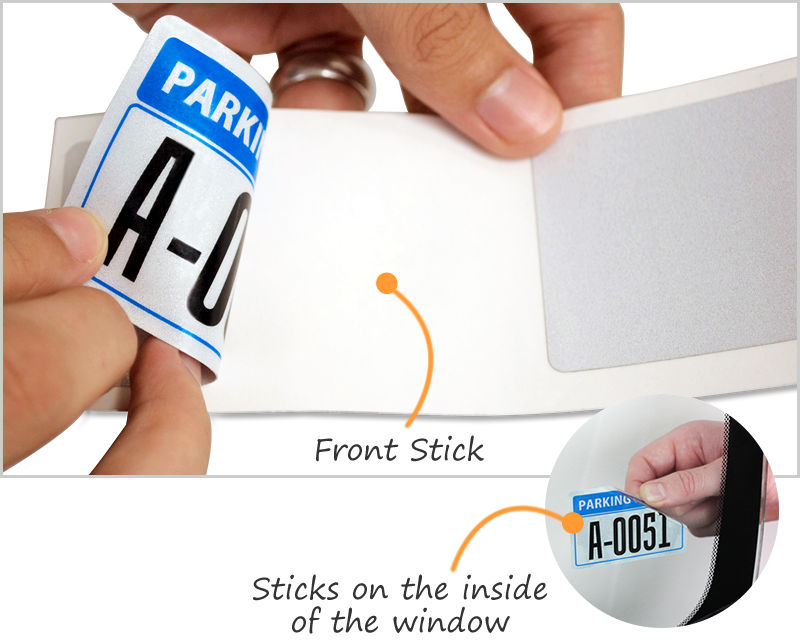 Our 10-year durable anodized aluminum parking permit decals come with an aggressive 5 mil thick 3M 468 MP adhesive. It creates a strong bond with the surface, and the decals are then permanently affixed to the window. You may apply these decals to flat window surfaces and plastic bumpers. Please ensure to clean the surface with Windex or soap and water before application. Avoid touching the backing with your fingers, as it can compromise the adhesive.