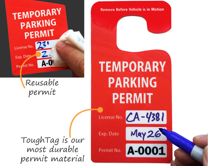 Parking permits specifically created hang conveniently on your vehicles rear-view mirror fall under the category of hang tags. It can be a hook or claw shape, or mirror cut-outs, that easily loop over the mirror, but stay in place once attached. These can be taken on and off easily, and are great for temporary use.