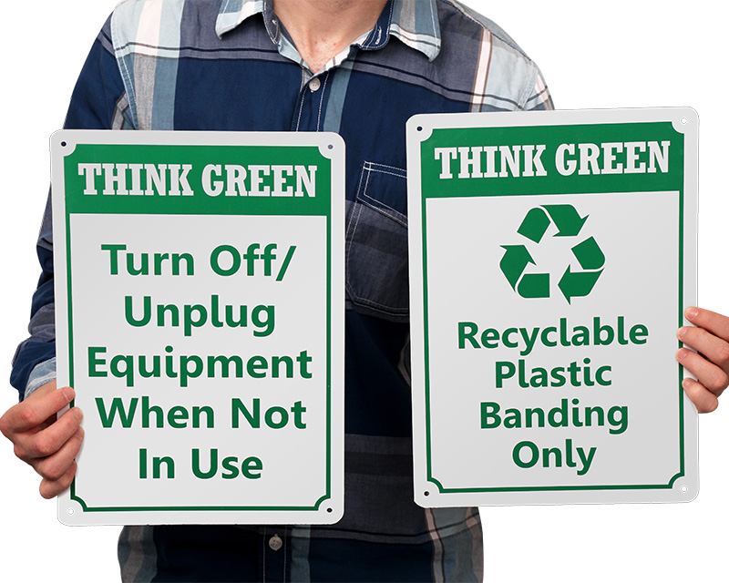 It only takes a sign to start something worthwhile! Post our range of Think Green Signs in your facility to encourage environment-friendly work practices. Ask employees and patrons to recycle, reuse, and be mindful of the resources they use. Our wide selection of signs can be used in the parking lot outside your building to the copy room on your floor.